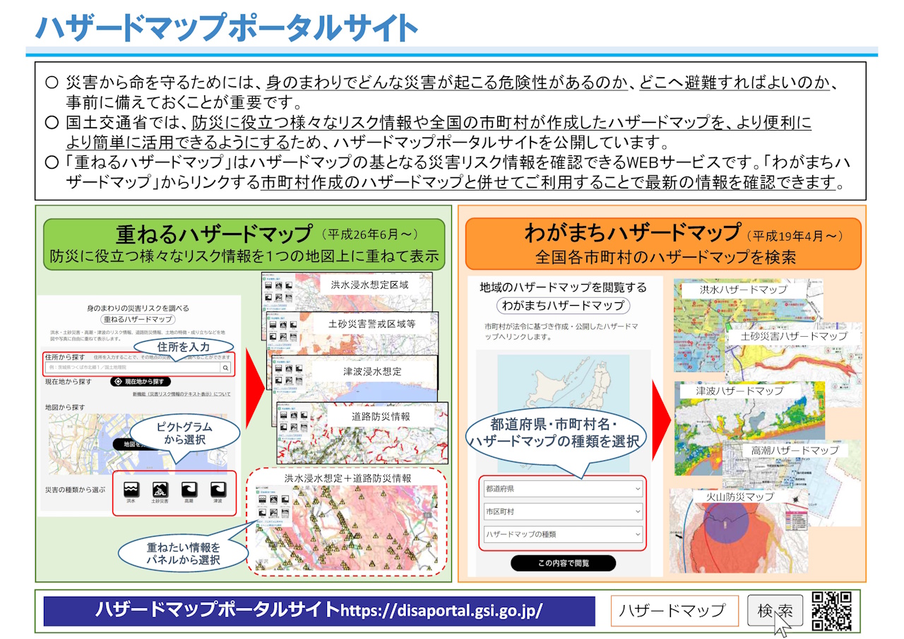 災害から命を守るためには、身のまわりでどんな災害が起こる危険性があるのか、どこへ避難すればよいのか、事前に備えて おくことが重要です。国土交通省では、防災に役立つ様々なリスク情報や全国の市町村が作成したハザードマップを、より便利により簡単に活用できるようにするため、ハザードマップポータルサイトを公開しています。