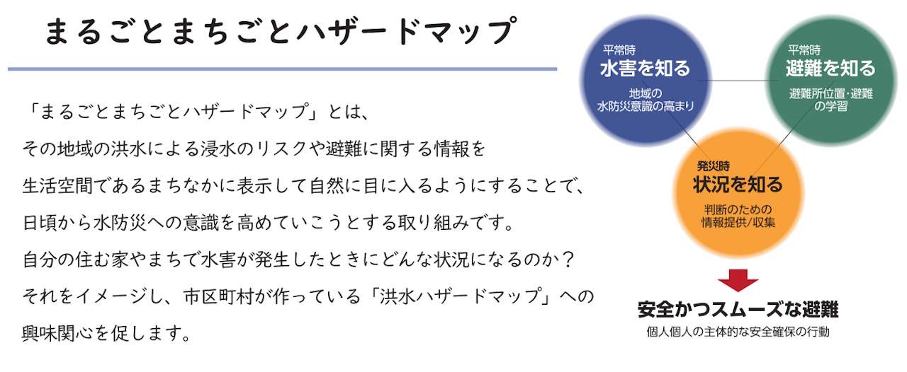 洪水ハザードマップの更なる普及浸透、及び住民等の水害に対する危機意識の醸成と避難所等の認知度の向上を図ることを目的として、まるごとまちごとハザードマップの取り組みを推進するため、平成18年に「まるごとまちごとハザードマップ実施の手引き」を作成し、取り組みが進められてきたところでしたが、平成27年9月関東・東北豪雨災害においては、避難の遅れ等により多くの住民が孤立し、約4,300人が救助されるなど、ハザードマップ等の防災情報が十分に認知されていないことが浮き彫りになりました。
